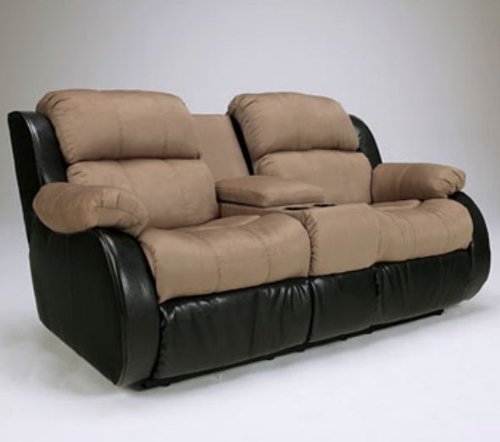 The two-toned contemporary design along with the plush comfort of the "Presley-Cocoa" upholstery collection creates a versatile and stylish collection that is the perfect choice for any living room decor. The plush pillow top arms and thick bustle back design work with the "scoop" chaise seating cushions to cradle you in the comfort you deserve. With the warm earth-toned fabric perfectly combined with the rich faux leather upholstery, this furniture creates a stylish two-toned contemporary collection that fits flawlessly into any home. Includes drop down storage console. This listing is for the loveseat only.