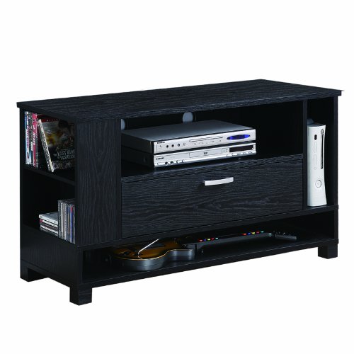Style and function combine to give this contemporary wood gaming console a striking appearance. The design gives a stylish modern look crafted with durable PVC laminate and MDF board. Console will accommodate most flat-screen TVs up to 52”, plus storage for all gaming gear.